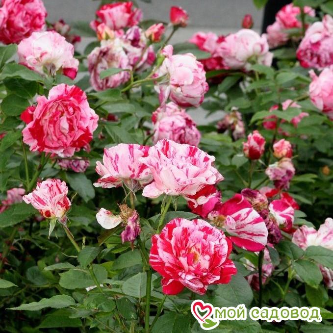 Сорт привлекает яркой двухцветной окраской. Доминирует темно-красный фон, по которому разбросаны полосы и размытые пятна белого цвета. Окраска цветков сохраняет контрастность до отцветания, не боится ни жару ни дождь. Цветки бокаловидные, позднее чашевидные, достигают 8 см в диаметре и состоят из около 30 лепестков. Аромат сильный, пряный, сладкий. Во время цветения соцветия покрывают весь куст. Побеги мощные, ветвистый куст достигает 1-1,5 м, цветки не поникают. Ширина куста 75-110 см. Листва крупная, темно-зеленая, густая. Хранение до посадки Как хранить растения, если вы получили посылку раньше начала посадочного сезона? Для хранения саженцев роз есть несколько простых правил: Если роза спит — храним в холодильнике или подвале при температуре от 0 до +4 °С, или на улице в коробке под толстым слоем снега. Если роза проснулась — прикопать в теплице или высадить в сад, обеспечив укрытие. Можно посадить розу в горшок и хранить в прохладном подвале или на балконе/лоджии, притеняя от прямых солнечных лучей. Во время хранения периодически проверяйте состояние посадочного материала. Поврежденные, загнившие части корней удалите и обработайте фунгицидом (Топаз, Фитоспорин).